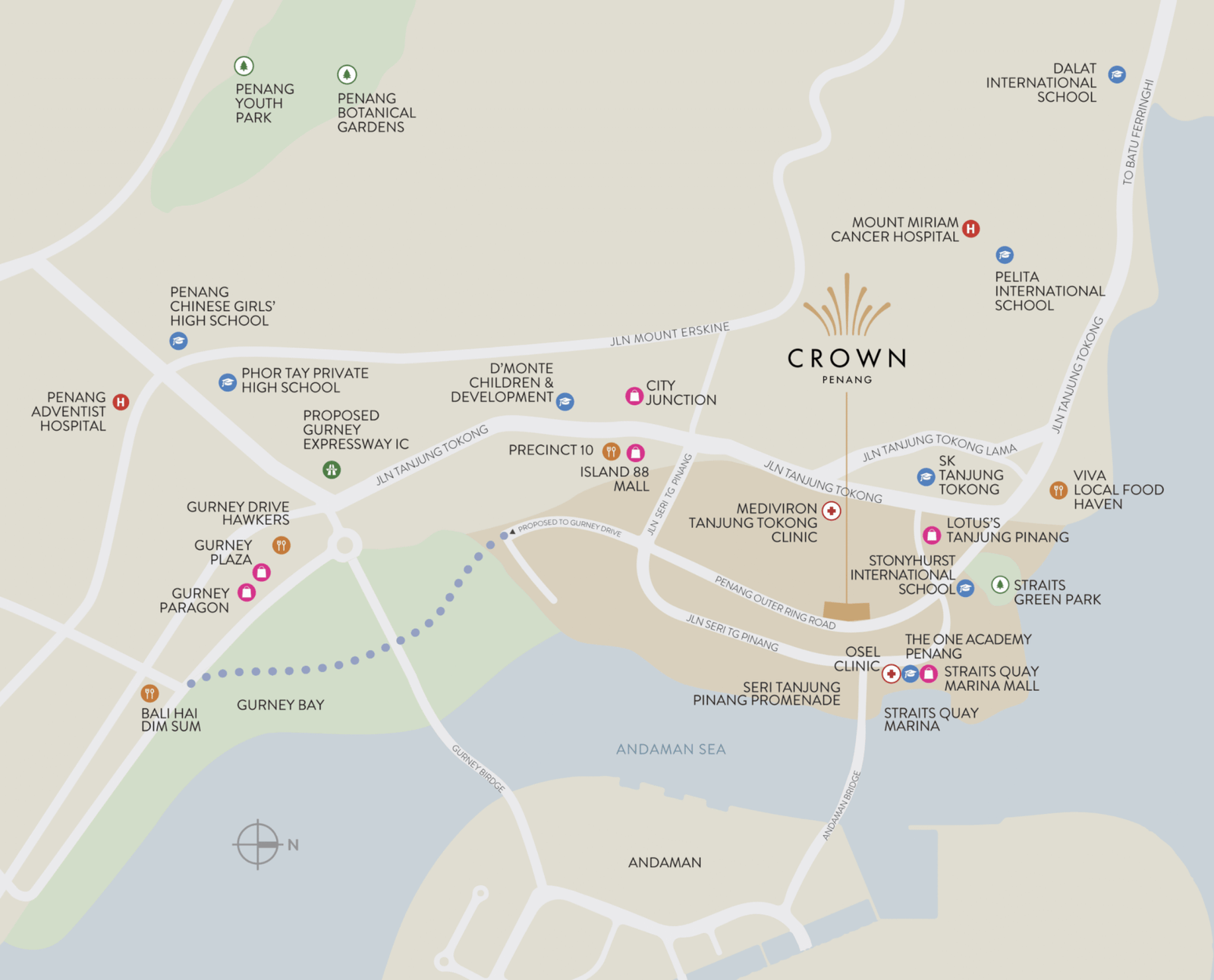 Situated in one of Penang’s most desirable and well-connected waterfront neighbourhoods, The Crown Penang places you moments away from everything that matters. From premier shopping and dining destinations to international schools, business hubs, and effortless access to George Town, major highways, and the Penang Bridge — connectivity, leisure, and lifestyle are always within reach.
